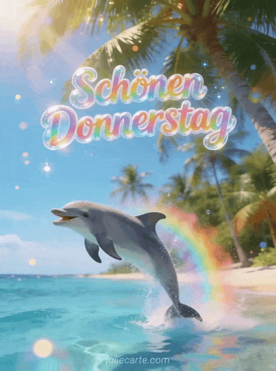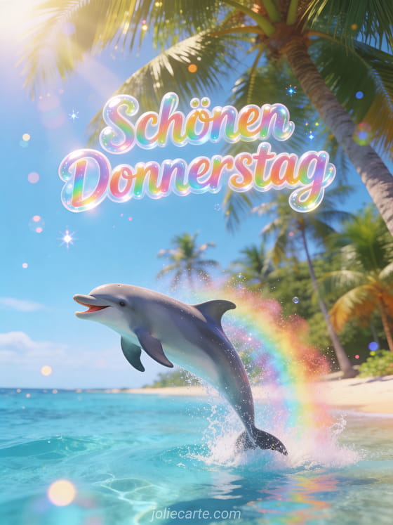 Senden Sie einen hellen Gruß zum schönen Donnerstag mit Regenbogen-Bubbly-Schrift und einem fröhlichen Delfin, der aus kristallblauem Wasser nahe einem tropischen Strand springt. Entdecken Sie auch animierte Schönen-Donnerstag-Karte, schönen Donnerstag Küsse oder Guten Morgen schönen Donnerstag Karte.