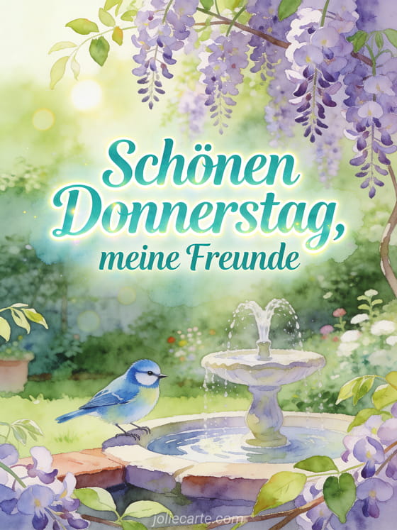 Sende einen freundlichen Gruß zum schönen Donnerstag an Freunde mit türkisfarbener Aquarellschrift, einer Blaumeise nahe einem kleinen Brunnen, blühender Glyzinie, frischem grünen Licht und einem sonnigen Garten. Teile auch ein Gedicht schönen Donnerstag Freunde, ein Schönen Donnerstag Bild GIF oder ein Schönen Donnerstag glitzerndes Bild.