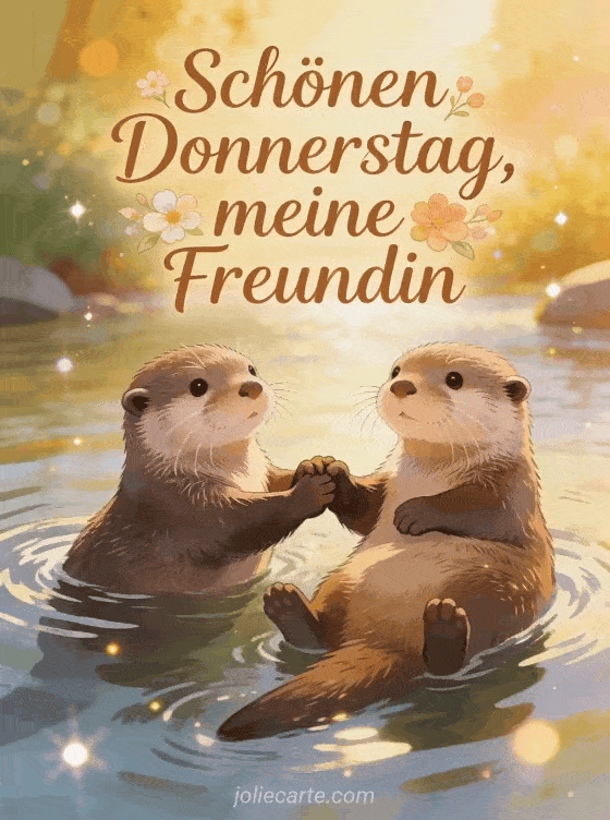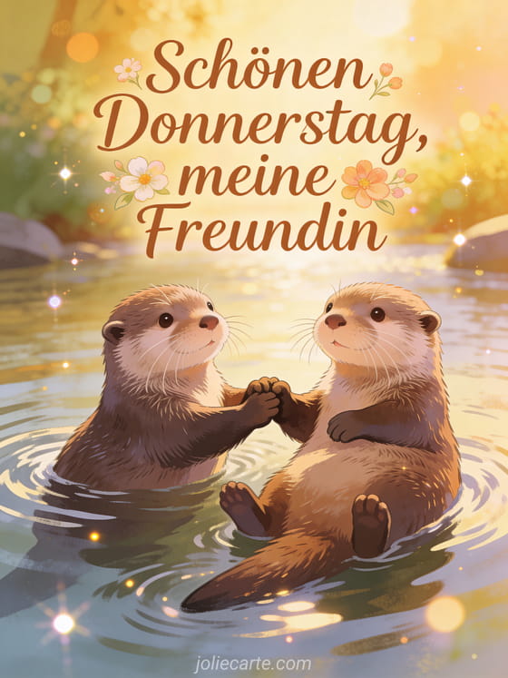 Teile schönen Donnerstag meine Freundin mit zwei niedlichen Ottern, die zusammen in einem friedlichen Fluss treiben und Pfoten halten, im Licht der goldenen Stunde. Sende weitere freundliche Wünsche mit Bilder vom Schönen Donnerstag, Donnerstag schönen Tag oder schönes Bild um Schönen Donnerstag zu sagen.