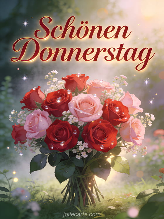 Senden Sie einen schönen Donnerstagsgruß mit roten und rosa Rosen, funkelndem Tau und warmem goldenem Licht. Entdecken Sie auch schönen Donnerstag positiv, Guten Morgen schönen Donnerstag GIF oder Karte guter Donnerstag.