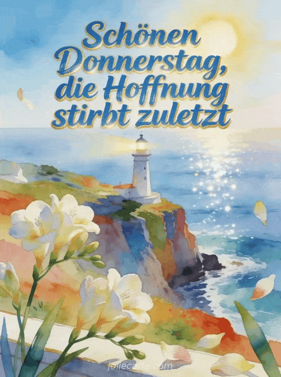 Teile eine inspirierende Karte für einen schönen Donnerstag mit Zitat, einem sonnigen Leuchtturm, einer bunten Meeresklippe und hellen Freesien im Vordergrund. Entdecke auch ein Schönen Donnerstag Katze GIF, ein Bild zum Wünschen eines schönen Donnerstags oder ein Schönen Donnerstag Kaffee Bild.