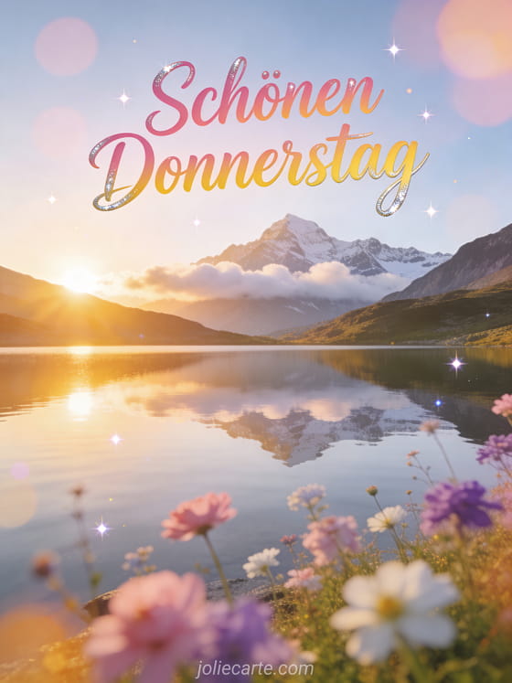 Senden Sie einen friedlichen Gruß zum schönen Donnerstag mit moderner Kalligrafie, einem gelassenen Bergsee bei Sonnenaufgang, Spiegelungen und Wildblumen im Vordergrund. Entdecken Sie auch schönen Donnerstag meine Freundin, Bilder vom Schönen Donnerstag oder Donnerstag schönen Tag.