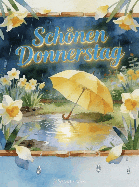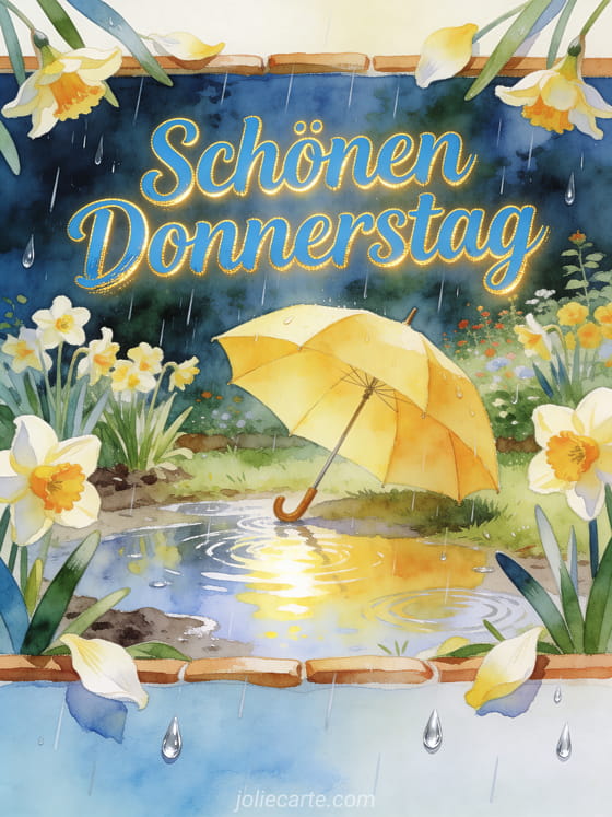 Teile einen schönen Donnerstag in einem fröhlichen Regengarten, mit Narzissen, einem gelben Regenschirm, hellen Pfützen und silbernen Regentropfen. Entdecke auch Guten Morgen schönen Donnerstag und schönen Tag, Schönen Donnerstag Blumenbilder oder Guten Morgen Donnerstag Bilder.