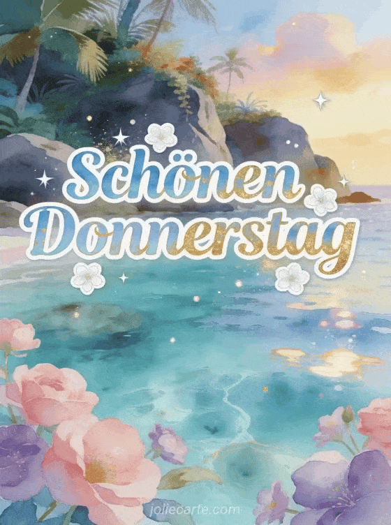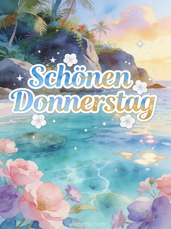 Sende Schönen Donnerstag schöne Karte mit pastellblauen und goldenen Aquarellbuchstaben, funkelnden Sternen und weißen Blumen über einer paradiesischen türkisfarbenen Bucht. Teile einen bezaubernden Wunsch unter der Woche und entdecke auch schönen Donnerstag GIF, Guten Morgen schönen Donnerstag Sport Bild oder Schönen regnerischen Donnerstag gif.