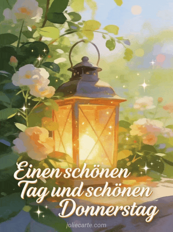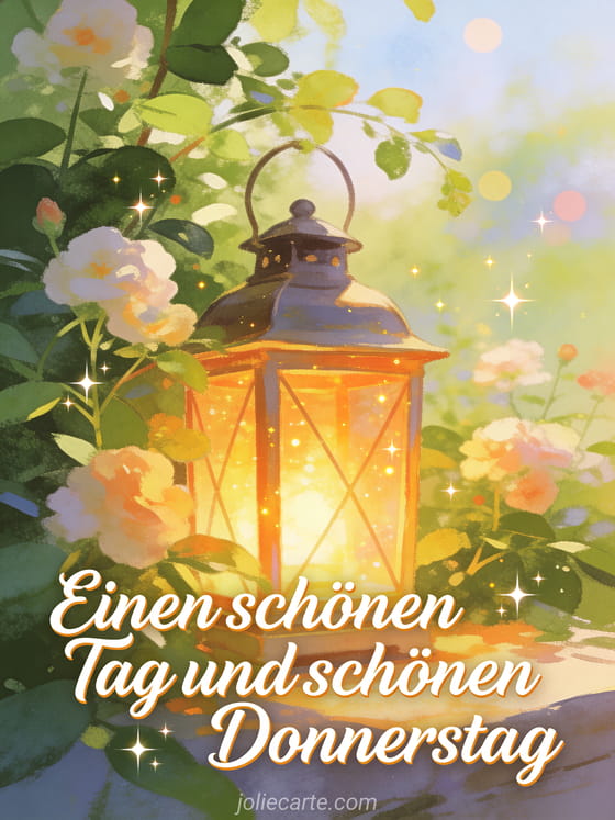 Teile ein schönes Bild für Donnerstag mit geschwungener Schrift, einer leuchtenden Laterne zwischen blühendem Grün und warmem Glanz. Dazu passen Schönen heißen Donnerstag Bild, kostenlose Bilder schöner Donnerstag Küsschen oder Guten Morgen es ist Donnerstag Bild.