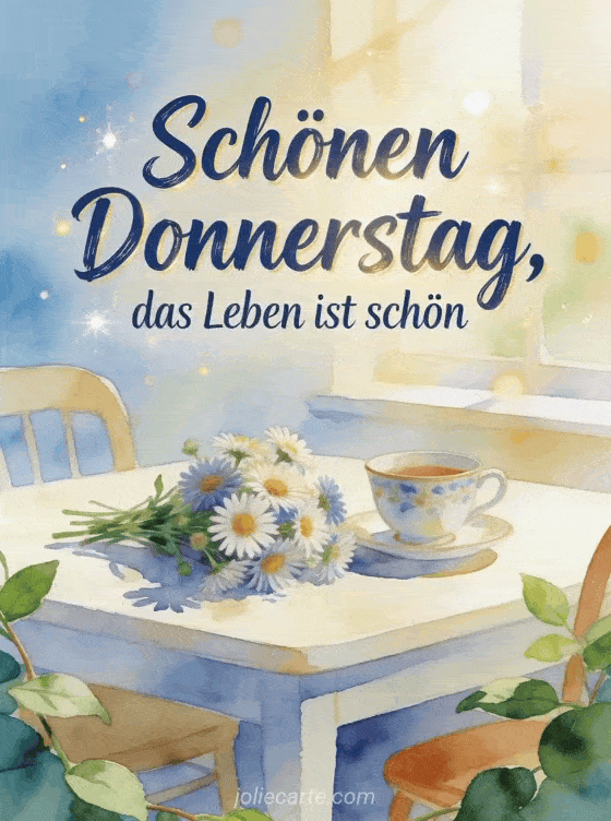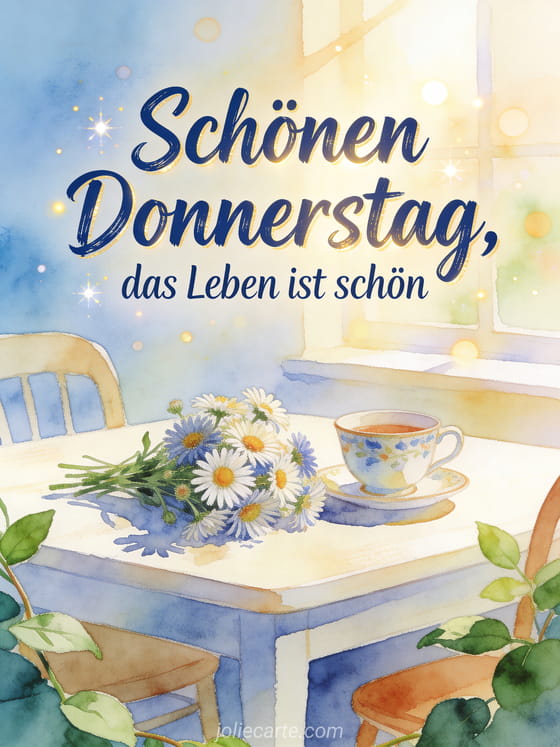 Sende schönen donnerstag text mit tiefblauer Pinselschrift, einem hellen Frühstückstisch, einer Porzellantasse, einem lockeren Asternstrauß und funkelndem Bokeh in warmem Morgenlicht. Dazu passen auch diese Schönen Donnerstag meine Freunde Bilder, dieses Gedicht schönen Donnerstag Freunde oder dieses Schönen Donnerstag Bild GIF.