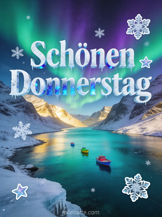 Teilen Sie eine Panorama-Karte zum schönen Donnerstag mit eisweißer Schrift, arktisch blauen Reflexen, Schneeflocken, frostigen Sternen, einem türkisfarbenen Fjord zwischen verschneiten Bergen, bunten Booten auf ruhigem Wasser und grün-violettem Nordlicht am Himmel. Sehen Sie auch Schönen Donnerstag Frau Bilder, dieses Bild um einen schönen Donnerstag zu wünschen oder Guten Morgen Donnerstag Bilder.