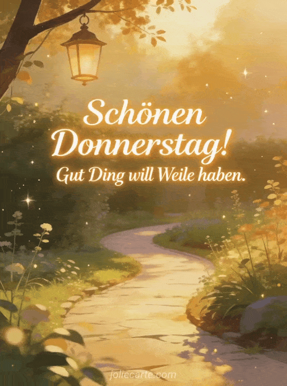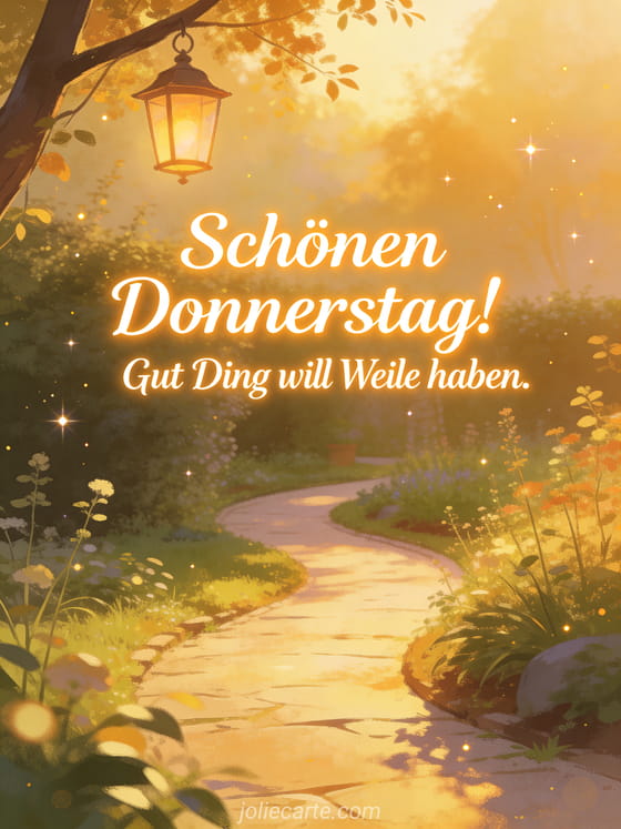 Teile eine nachdenkliche Nachricht zum schönen Donnerstag mit raffinierter Schrift, warmem Leuchten, einem gewundenen Gartenweg, einer Laterne im Morgengrauen, sanftem Goldlicht und zarten Funken. Entdecke auch schönen Tag Donnerstag, schönen Donnerstag Katze oder Karte schönen Tag Donnerstag.