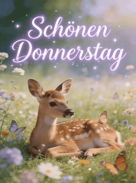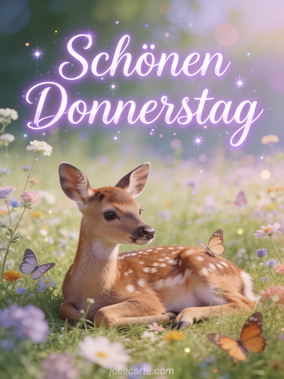Wünschen Sie einen schönen Donnerstag mit dieser friedlichen Grußkarte. Ein bezauberndes Rehkitz liegt in einer Wildblumenwiese mit Schmetterlingen in einer sanften pastoralen Szene. Entdecken Sie auch eine Donnerstag Grußkarte, eine Donnerstag Grußkarte oder eine Guten Morgen Donnerstag Karte.