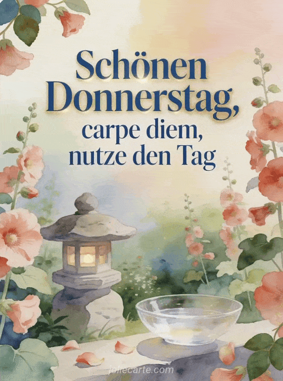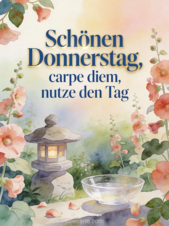 Teile einen ruhigen schönen Donnerstag mit einem friedlichen Aquarellgarten, Stockrosen um eine Steinlaterne und einer klaren Wasserschale. Du kannst auch schönen donnerstag text, Schönen Donnerstag meine Freunde Bilder oder Gedicht schönen Donnerstag Freunde teilen.