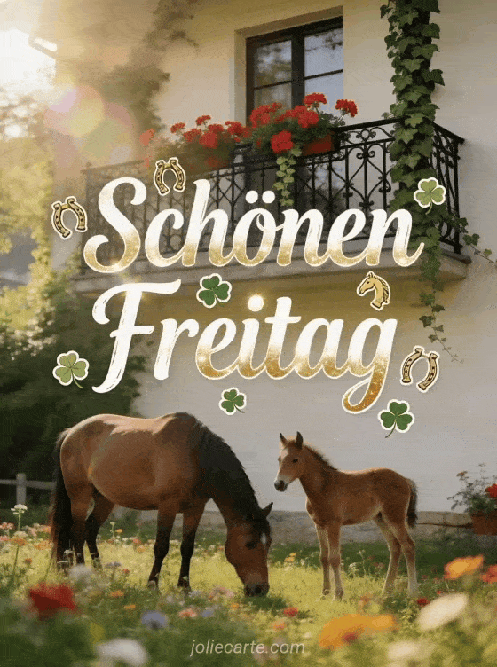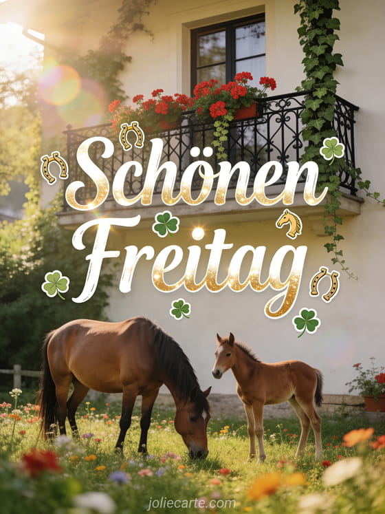 Teilen Sie eine leuchtende Landkarte zum schönen Freitag mit cremefarbener Schrift, goldenen Reflexen, Hufeisen, Kleeblättern, einem schwarzen schmiedeeisernen Balkon mit roten Geranien und Efeu sowie einer Stute und ihrem Fohlen auf einer Blumenwiese darunter. Sehen Sie auch Schönen Freitag lustiger Humor, Schönen Freitag Blumen Bilder oder Schönen Freitag Landschaft.