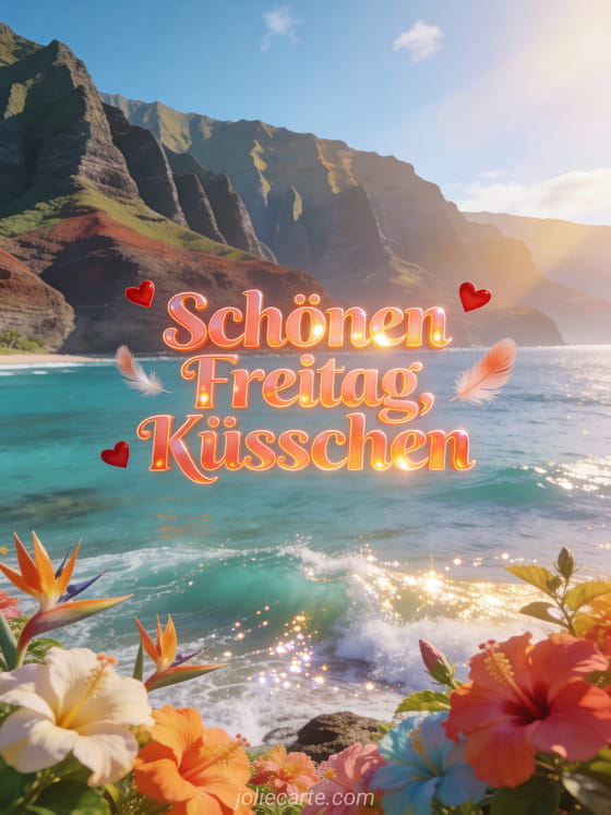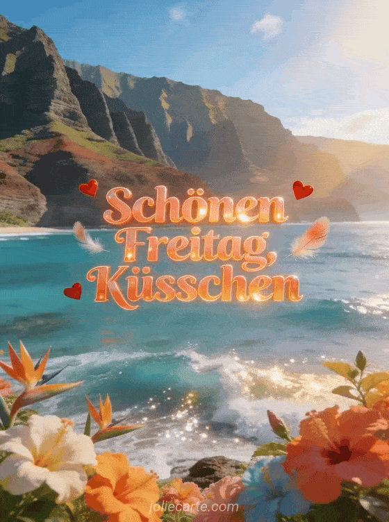 Sende ein Schönen-Freitag-Bild Küsschen mit sanften korallfarbenen Buchstaben, kleinen roten Herzen, leichten Federn und der spektakulären Na-Pali-Küste im goldenen Wintersonnenlicht. Teile einen zarten Wunsch zum Wochenausklang und entdecke auch Karte schönen Freitag, lustiges Schönen Freitag Humor gif oder Schönen Freitag Küsse animierte GIFs.