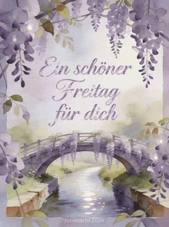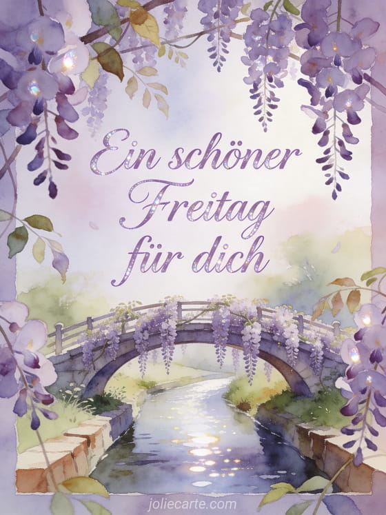 Teile einen gelassenen Gruß zum schönen Freitag mit anmutiger lavendelfarbener Schrift und Perlenschimmer. Diese kostenlose Karte zeigt eine Bogenbrücke über einem schmalen Fluss unter hängender Glyzinie, mit herabfallenden Blüten und leuchtenden Reflexen. Entdecke auch Schönen Freitag und schönes Wochenende Bilder, ein Guten Morgen Freitag GIF oder einen Schönen Freitag Text.