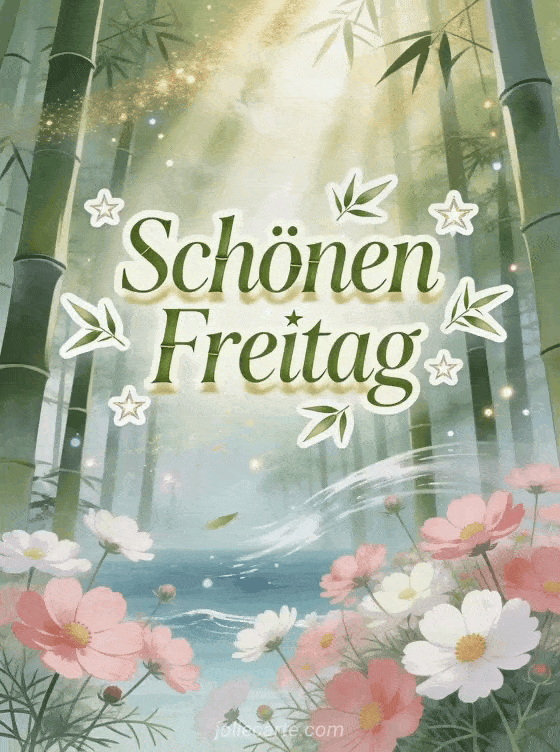Teilen Sie eine leuchtende Karte zum schönen Freitag mit feiner bambusgrüner Schrift, Sternschnuppen, schwebenden Bambusblättern, einem japanischen Bambuswald, rosa und weißen Cosmossträußen und sanften goldenen Lichtstrahlen. Sehen Sie auch Schönen Freitag Landschaft, diese Schönen Freitag Karte oder Guten Morgen es ist Freitag Humor.