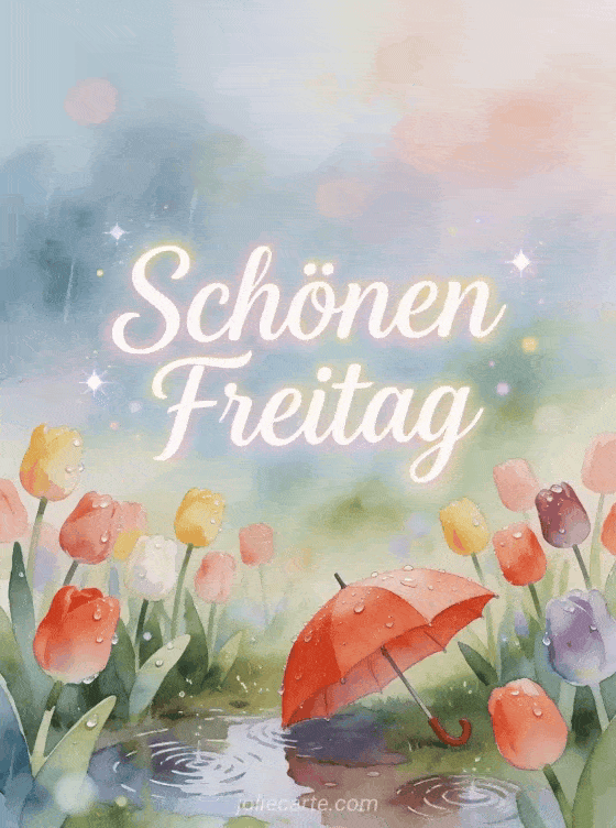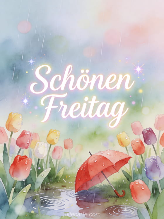 Teile einen sanften und frischen Regentag-Freitagsgruß mit glänzenden Tulpen und einem roten Regenschirm. Entdecke auch eine Landschaft Natur schönen Freitag Karte oder eine Nachricht schönen Freitag Karte.