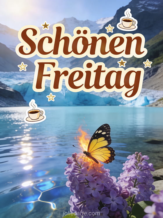 Teilen Sie eine elegante Karte zum schönen Freitag mit warmen kaffeebraunen Buchstaben, cremigen Reflexen, kleinen dampfenden Tassen, goldenen Sternen, einem milchblauen Gletschersee, umliegenden Bergen und einem gelb-schwarzen Segelfalter auf einem Strauß violetten Flieders. Sehen Sie auch Nachricht um Muslimen einen schönen Freitag zu wünschen, Schönen Freitag Kätzchen oder diese Guten Morgen Freitag Bilder.