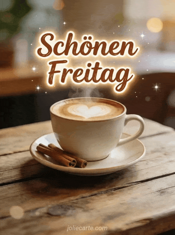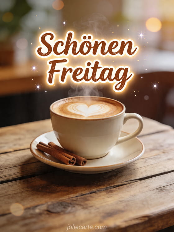 Schönen Freitag ein gemütlicher Freitagsgruß mit Cappuccino und warmem Morgenlicht