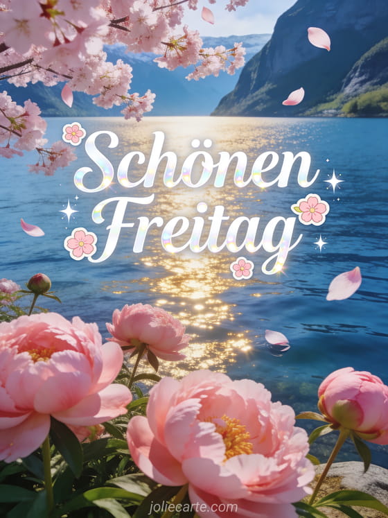 Teilen Sie eine zarte Karte zum schönen Freitag mit eleganter weißer Perlmuttschrift, kleinen rosa Blüten, funkelnden Sternen, Kirschblüten über einem tiefblauen Fjord und rosa Pfingstrosen im Vordergrund. Sehen Sie auch Guten Morgen es ist Freitag Humor, diese Karte schönen Tag Freitag oder ein Schönen Freitag Zen Zitat.