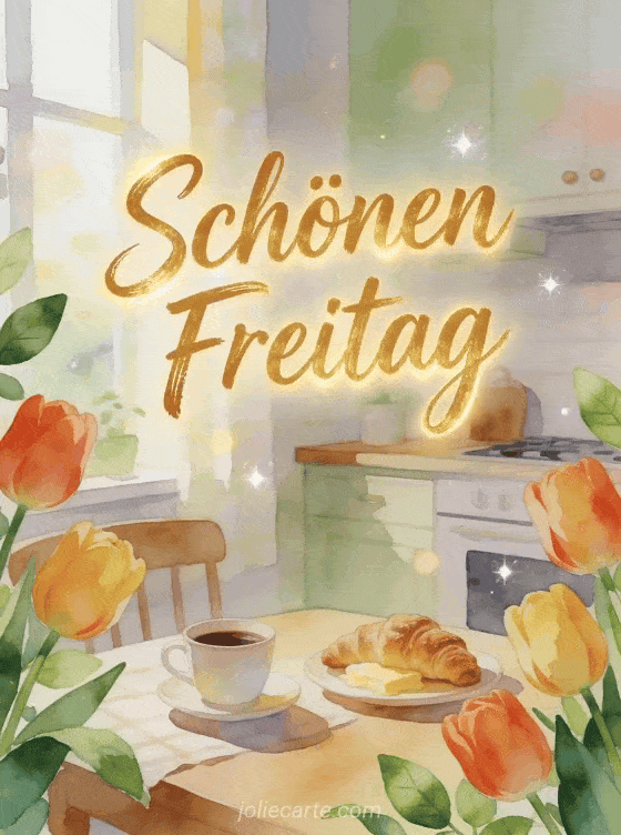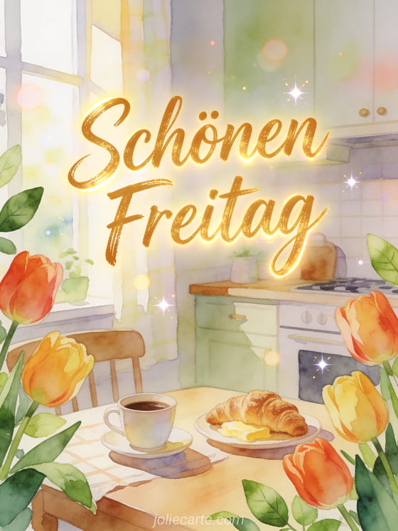 Sende einen fröhlichen schönen Freitag Gruß mit leuchtenden Tulpen, frischen Blättern, einer Kaffeetasse und buttrigen Croissants auf einem gemütlichen Morgentisch in einer sonnigen Küche. Entdecke auch Text zum Wünschen eines schönen Freitags, ein schönen Freitag Schmetterling Bild oder Schönen Freitag animierte Bilder.