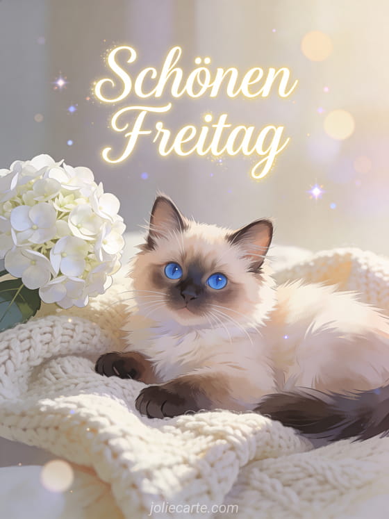 Teile einen sanften Gruß zum schönen Freitag mit eleganter cremefarbener Glitzerschrift, einem flauschigen Siamkätzchen mit blauen Augen auf einer gemütlichen Strickdecke und weißen Hortensien in der Nähe. Entdecke auch Guten-Morgen-Freitag-Bilder, eine Weihnachtskarte zum schönen Freitag oder virtuelle Karten zum schönen Freitag.