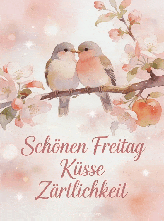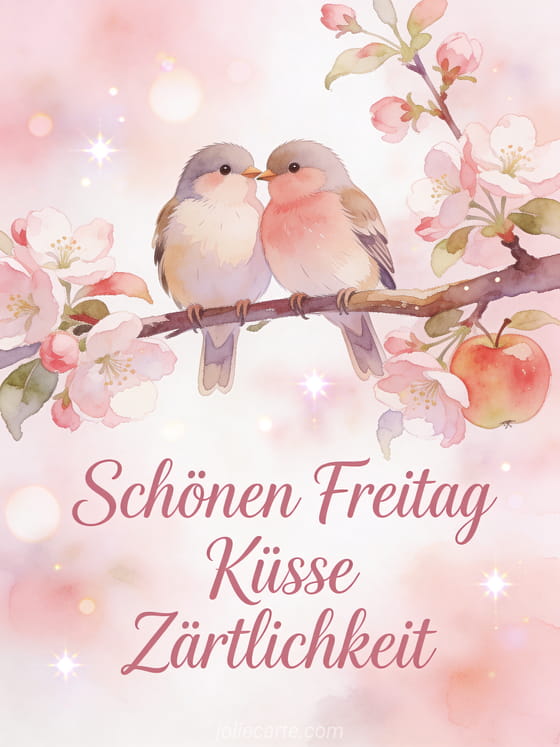 Teile einen zärtlichen Freitagsgruß mit verliebten Vögeln auf einem blühenden Apfelbaum im Frühling. Entdecke auch eine schönen Freitag Natur Karte oder eine Bild schönen Freitag Karte.
