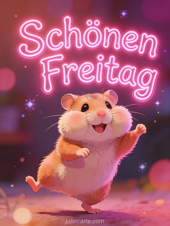 Teile einen lustigen Gruß zum schönen Freitag mit wackeligen neonpinken Buchstaben und einem witzigen Hamster mit vollen Backen, der einen fröhlichen Tanz macht. Entdecke auch Blumenbilder zum schönen Freitag, eine Landschaftskarte zum schönen Freitag oder eine Karte zum schönen Freitag.