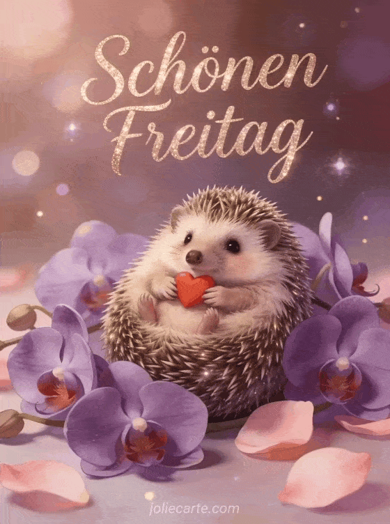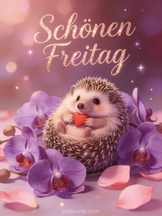 Teile einen warmen Gruß zum schönen Freitag mit roségoldener Kalligrafie, einem niedlichen Babyigel, der eingerollt ein kleines rotes Herz hält, violetten Orchideen und weichen rosa Blütenblättern. Entdecke auch ein Guten-Morgen-Freitag-GIF, eine Guten-Morgen-Karte zum schönen Freitag mit Humor oder eine Landschaftskarte zum schönen Freitag.