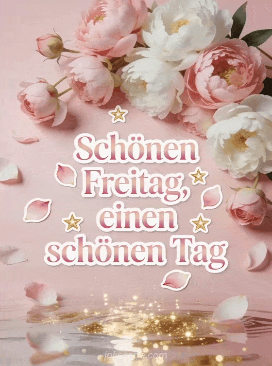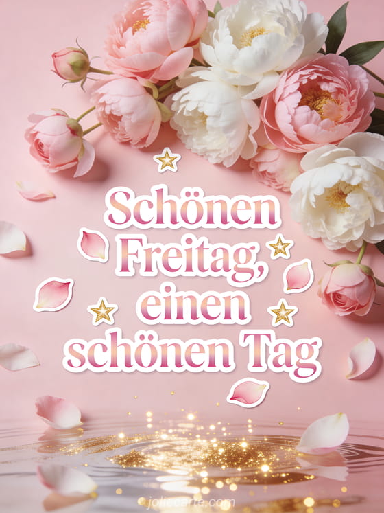Teile eine sanfte Freitagsbotschaft mit Pfingstrosen, Rosenblättern, goldenen Sternen und einem warmen Wunsch für einen schönen Tag. Entdecke auch Guten Morgen ausgezeichneter Tag am Freitag, schönes bild von schönen freitag oder schönen sonnigen freitag.