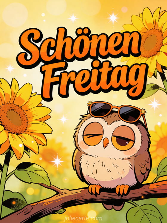 Teile einen fröhlichen Gruß zum schönen Freitag mit verspielter orangefarbener Comicschrift, einer kleinen lustigen Eule mit großen runden Augen, winziger Wochenendbrille und gelben Sonnenblumen. Entdecke auch ein Kaffeebild zum schönen Freitag, eine Nachricht, um Muslimen einen schönen Freitag zu wünschen oder eine Karte zum schönen Freitag mit Kätzchen.