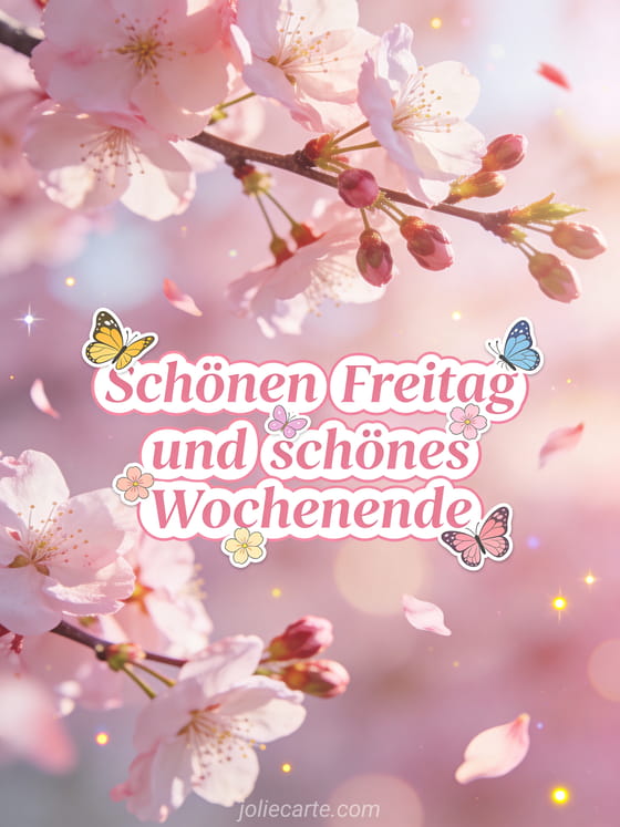 Teile einen fröhlichen Gruß für Freitag und Wochenende mit Kirschblütenzweigen, bunten Schmetterlingen, zarten rosa Blütenblättern und hellem Frühlingslicht. Du kannst auch Guten Morgen Freitag Humor GIF oder Schönen Freitag Landschaft GIF senden.