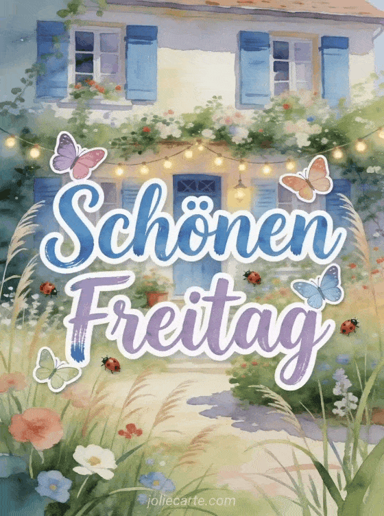 Teilen Sie eine sanfte Karte zum schönen Freitag mit handgemalter lavendelblauer Schrift, bunten Schmetterlingen, kleinen Marienkäfern, einem Landhaus mit blauen Fensterläden, üppigem Blumengarten, hohen Gräsern im Wind und Lichterketten an der Fassade. Sehen Sie auch Schönen Freitag Tiere, Schönen Freitag mein Schatz oder Guten Morgen Freitag gif.