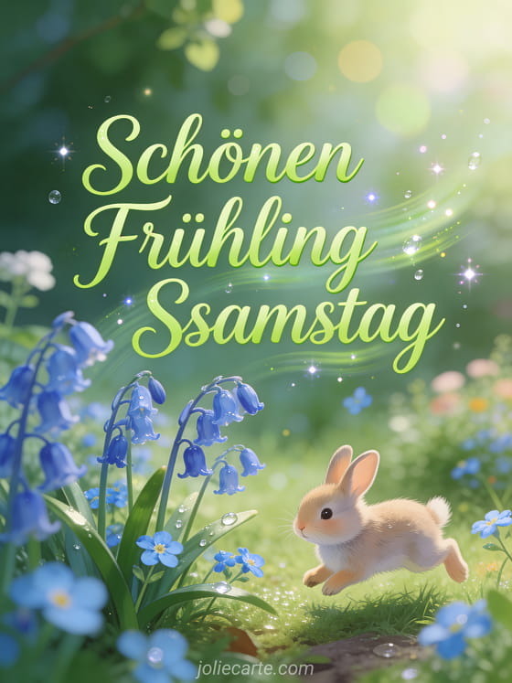 Teile einen fröhlichen Frühlingssamstagsgruß mit einem süßen kleinen Hasen zwischen Hyazinthen und Vergissmeinnicht, Morgentau und frischem Licht. Du kannst auch ein Bild für schönen Samstag oder schönen Tag schönen Samstag Küsse senden.
