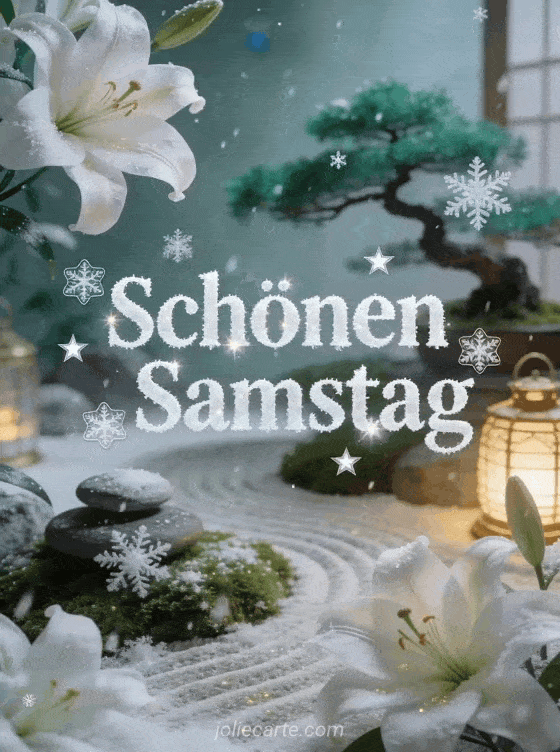 Senden Sie eine ruhige Karte zum schönen Samstag mit frostweißen Buchstaben, Schneeflocken-Stickern, einem Zen-Garten mit Bonsai und smaragdgrünem Moos, majestätischen weißen Lilien und sanftem Schnee im goldenen Laternenlicht. Entdecken Sie auch Schönen sonnigen Samstag Bilder, schönen Samstag meine Freundinnen Bild oder animiertes Bild schönen Samstag.