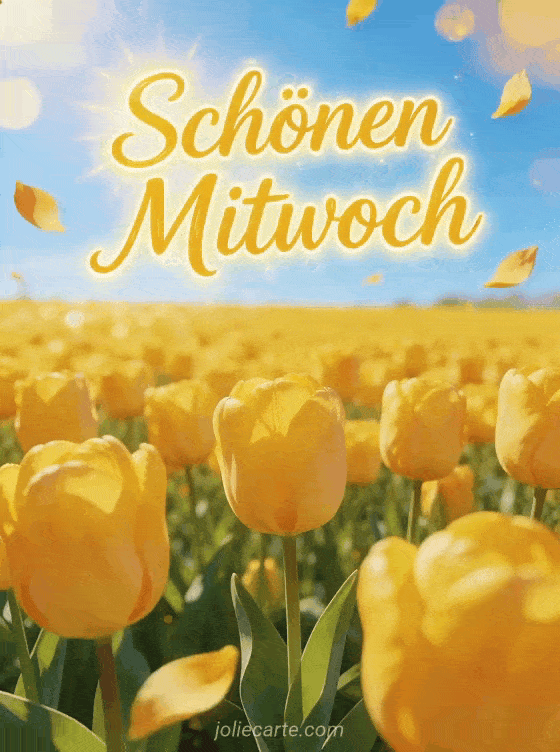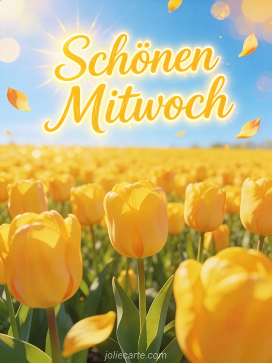 Teile einen sonnigen schönen Mittwoch mit allen mit dieser strahlenden Karte von gelben Tulpen, die sich unter einem klaren blauen Himmel erstrecken. Entdecke auch schönen mittwoch kuss oder kaffee guten morgen schönen mittwoch.