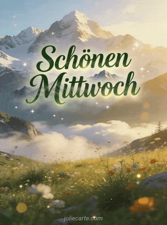 Sende einen ruhigen Gruß zum schönen Mittwoch mit schneebedeckten Alpengipfeln, einer Wildblumenwiese und goldenem Morgenlicht über ziehenden Wolken. Entdecke auch animierte Schönen-Mittwoch-Bilder, guten Morgen es ist Mittwoch oder Guten Morgen meine Schöne Mittwoch.