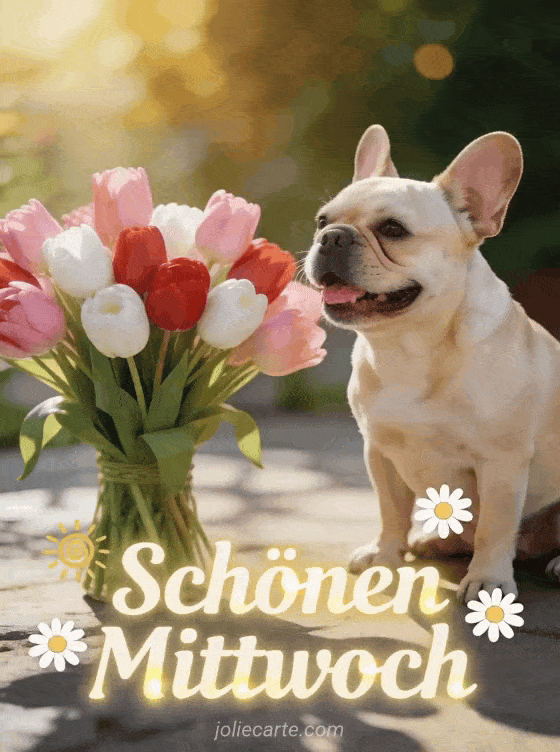 Teile einen schönen Mittwochsgruß mit bunten Tulpen, einer fröhlichen Französischen Bulldogge und sanftem goldenen Morgenlicht. Entdecke auch sonnige schönen mittwoch gifs, funkelndes schönen mittwoch bild und blumen schönen mittwoch bilder.