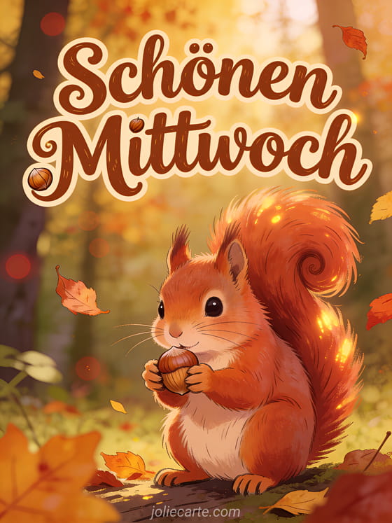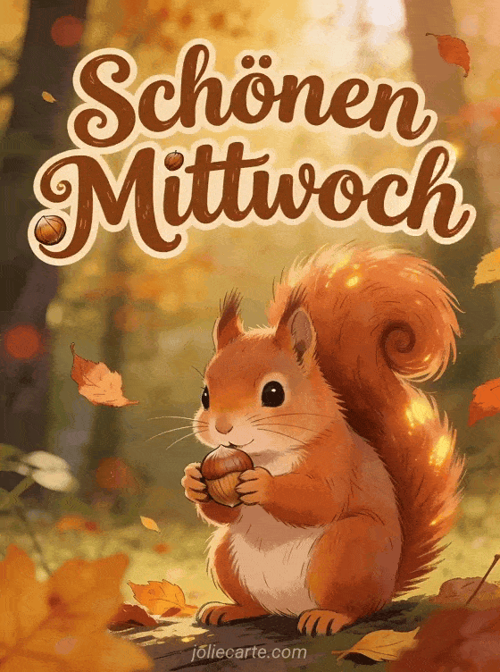 Sende einen entzückenden Gruß zum schönen Mittwoch mit einem flauschigen roten Eichhörnchen, das eine Haselnuss hält, den buschigen Schwanz im warmen Herbstwaldlicht eingerollt. Entdecke auch Schönen Mittwoch animiertes GIF, jeden Tag denke ich an dich yosa prod oder Herz Herz Zärtlichkeit schönen Mittwoch Küsse.