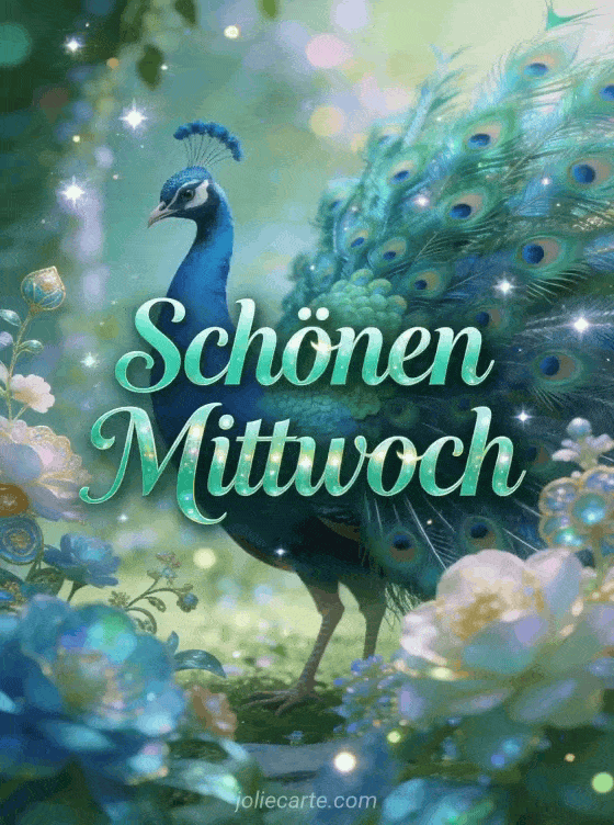 Sende einen eleganten Gruß zum schönen Mittwoch mit einem majestätischen Pfau, der seine schillernden Federn in einem königlichen Garten mit kunstvollen Blumen zeigt. Entdecke auch einen Blumenstrauß schönen Mittwoch, ein animiertes GIF schönen Mittwoch Küsschen oder ein Schönen Mittwoch Katzen-GIF.