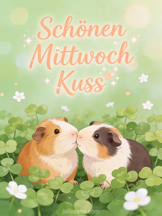 Teile einen süßen Mittwochskuss mit dieser entzückenden Karte von zwei Meerschweinchen, die sich in einem weichen Kleebettchen kuscheln. Entdecke auch kaffee guten morgen schönen mittwoch oder foto sonniger mittwoch.