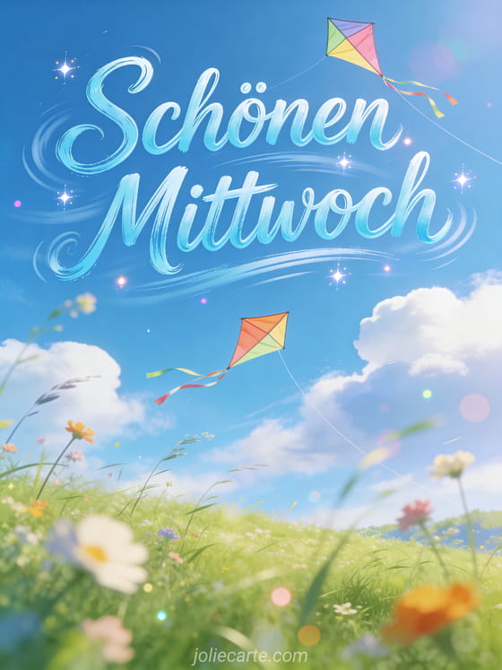 Sende einen freien Gruß zum schönen Mittwoch mit bunten Drachen, die hoch in einem hellblauen Himmel über einer grünen Wiese fliegen, mit ziehenden Wolken und Wildblumen im Wind. Entdecke auch Guten Morgen Schönen Mittwoch Bilder, Schönen sonnigen Mittwoch Bilder oder Karte schönen Mittwoch Küsse.