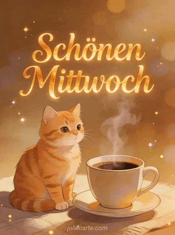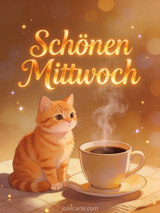 Wünschen Sie einen schönen Mittwoch mit dieser gemütlichen Grußkarte. Eine niedliche orange Tigerkatze sitzt neben einer dampfenden Tasse Kaffee und verbreitet Wärme und gute Laune. Entdecken Sie auch eine Schönen Mittwoch Karte, eine Guten Morgen und Schönen Mittwoch Karte oder eine Schönen Mittwoch Karte.