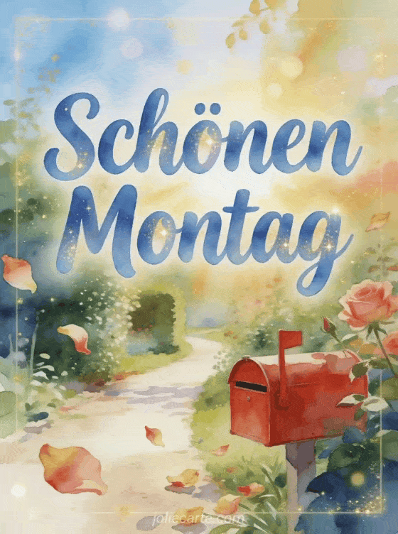 Teile schönen Montag mit einem fröhlichen Aquarell-Gartenweg bei Sonnenaufgang, einem roten Briefkasten, treibenden alten Rosenblättern und sanftem Goldfunkeln. Du kannst auch schönen montag schöne bilder, ein Schönen Montag warmes Bild oder ein Schönen Montag und schöne Woche animiertes Gif Gif senden.
