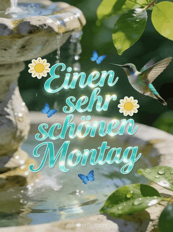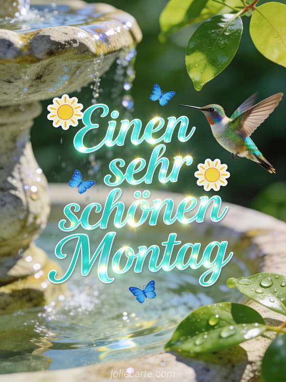 Sende einen sehr schönen Montag mit einem fotorealistischen Kolibri, der neben einem funkelnden Steinbrunnen und glänzenden grünen Blättern fliegt. Entdecke auch kostenloses Bild schönen Montag gute Woche, Guten Morgen Montag Bild oder Guten Morgen schönen Montag und gute Woche Küsse.