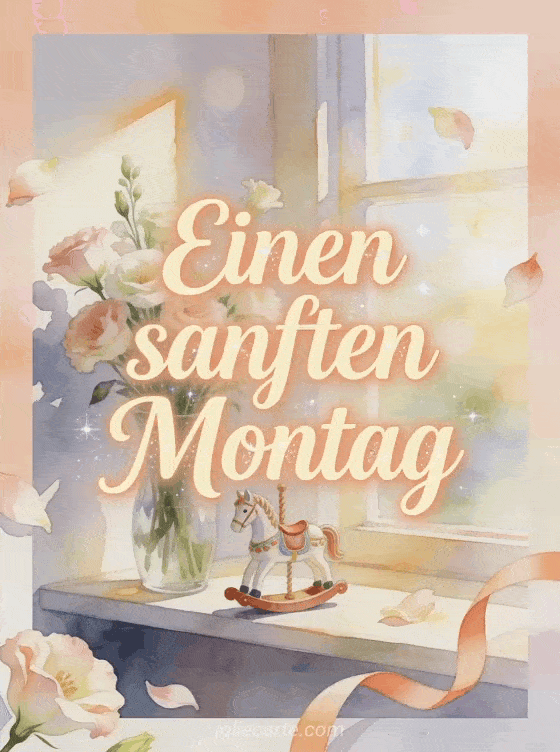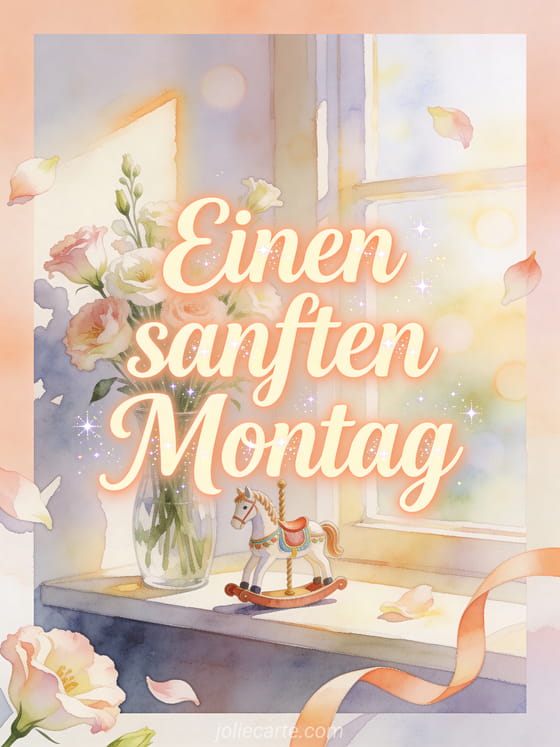 Wünsche einen sanften Montag mit einer Aquarellszene auf einem sonnigen Regal, mit einem kleinen Karussellpferd, einer Vase Lisianthus, gekringelter Schleife und zartem Morgenglanz. Entdecke auch eine Karte mit Schönen Montag viel Erfolg Bild, schöne Bilder für schönen Montag und gute Woche oder Guten Kaffee am Montag Bilder.