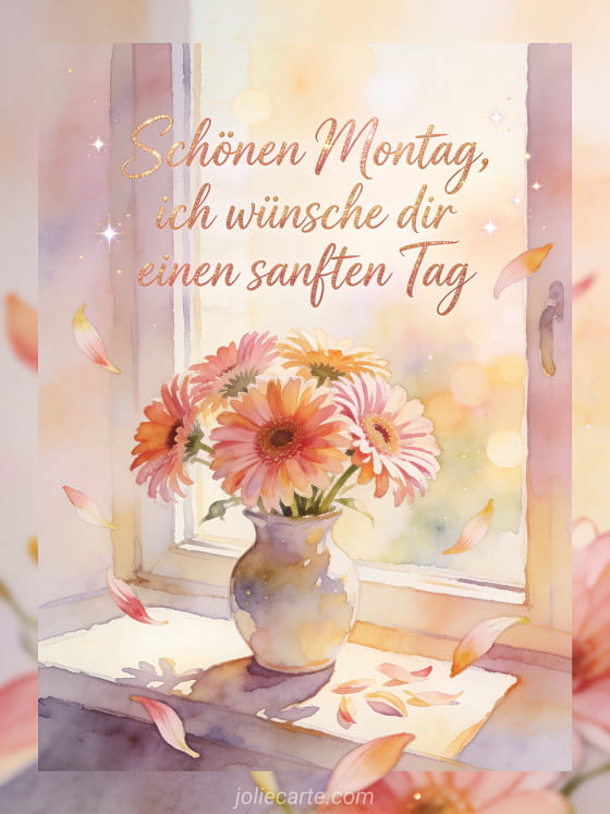 Wünsche einen sanften schönen Montag mit roségoldener Kalligrafie, einer Porzellanvase voller Gerbera auf einer sonnigen Fensterbank und warmem Aquarelllicht. Entdecke auch Schönen Montag Glitzerbild, kaltes Schönen-Montag-Bild oder Schönen Montag animierte Bilder.