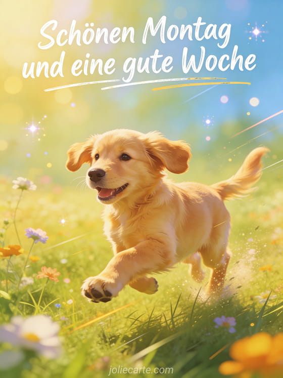 Senden Sie einen energischen Gruß für schönen Montag und eine gute Woche mit Schrift im Animationsstil und einem fröhlichen Golden-Retriever-Welpen, der über eine Wiese läuft. Entdecken Sie auch schönen Montag Kaffee Bild, schönen Montag Guten Morgen gute Woche oder Guten Morgen und schönen Montag GIF.