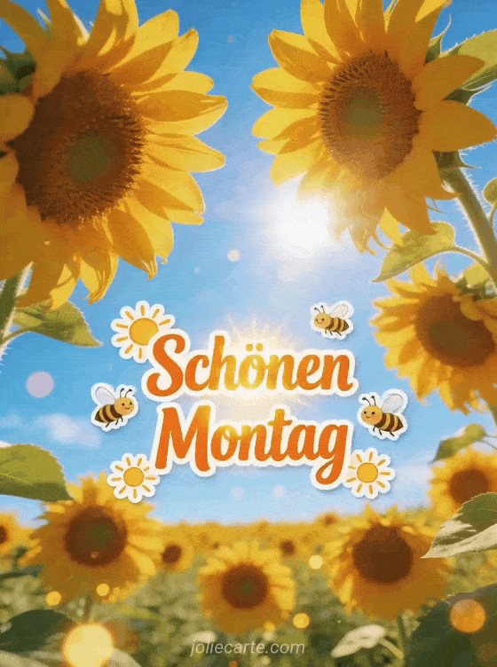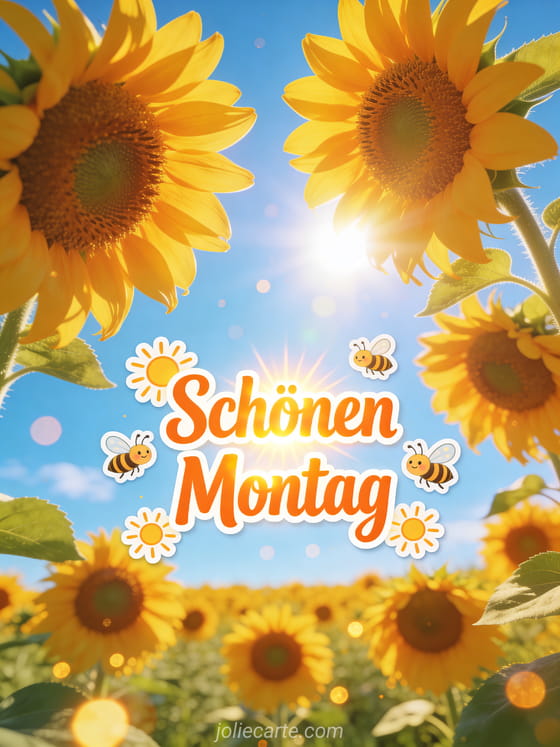 Sende Schönen Montag Humor animiertes GIF mit leuchtend orangefarbenen Buchstaben, kleinen strahlenden Sonnen, fröhlichen Bienen und einem Feld riesiger Sonnenblumen unter klarem blauem Himmel. Teile einen heiteren Wunsch zum Wochenstart und entdecke auch schönen Montag glitzerndes Bild, schönen Montag schöne Woche animiertes GIF oder schönen Montag Küsschen GIFs.