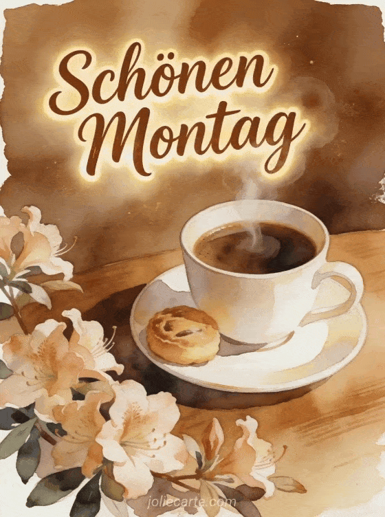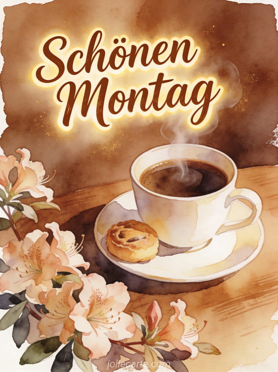 Beginne die Woche mit einem herzlichen Montagsgruß in Aquarell, mit einer dampfenden Kaffeetasse, kleinem Gebäck und Azaleenblüten. Du kannst auch schönen Montag blumiges Bild, Schönen Montag animierte GIFs oder Schönen Montag Sonne Bild teilen.