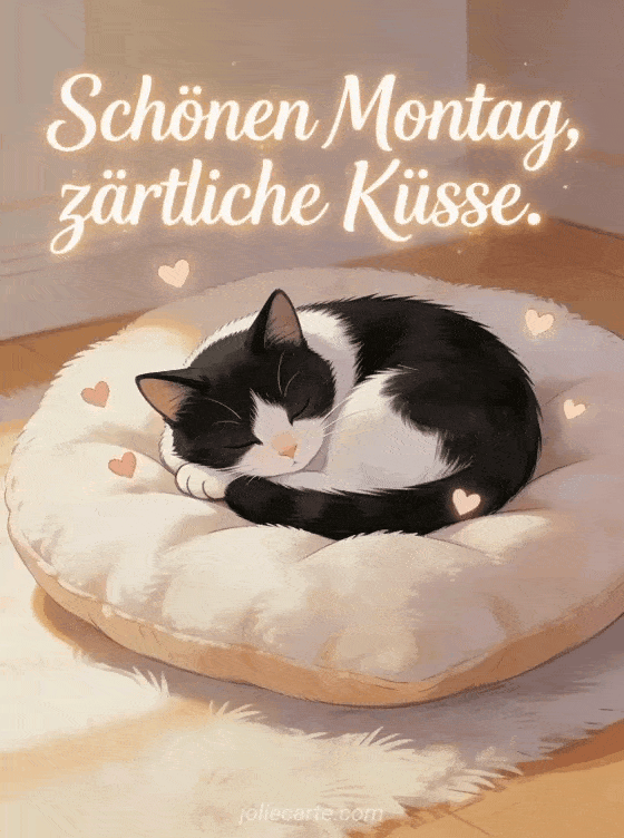Schönen Montag, zärtliche Küsse. ein zärtlicher Montagsgruß mit einer gemütlichen Katze