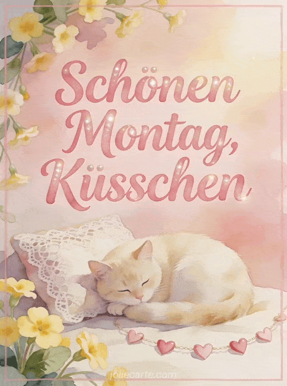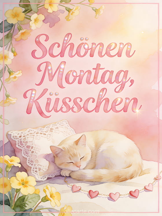Sende schönen Montag Küsschen schöne Bilder mit rosa Aquarellschrift, einer cremefarbenen Katze neben einem Spitzenkissen, einer kleinen Herzgirlande und Primeln, die über den Rand reichen. Dazu passen auch dieses Schönen Montag Zitat Bild, dieses Schönen Montag im Regen Bild oder dieses schönen Montag und schöne Woche animiertes GIF.